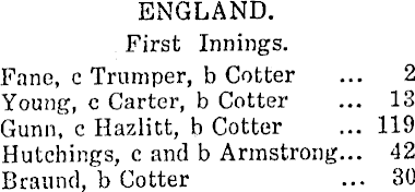 ENGLAND. First Innings. Fane, c Trumper, b Cotter ... 2 Young, c Carter, b Cotter ... 13 Gunn, c Hazlitt, b Cotter ... 119 Hutehings, c and b Armstrong... 42 Braund, b Cotter ... 30