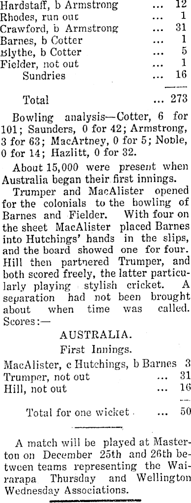 Hard3taff, b Armstrong ... 12 Rhodes, run one ... 1 Crawford, b Armstrong ... 31 Barnes, b Cotter ... 1 iJlythe, b Cotter ... 5 Fielder, not out ... 1 Sundries .-• 16 Total ... 273 Bowling analysis—Cotter, 6 for 101; Saunders, 0 for 42; Armstrong, 3 for 63; MacArtney, 0 for 5; Noble, 0 for 14; Hazlitt, 0 for 32. About 15,000 were present when Australia began their first innings. Trumper and MacAlister opened for the colonials to the bowling of Barnes and Fielder. With four on the sheet MacAlister placed Barnes into Hutehings' hands in the slips, and the board showed one for four. Hill then partnered Trumper, and both scored freely, the latter particularly playing stylish cricket. A separation had not been brought about when time was called. Scores:— AUSTRALIA. First Innings. MacAlister, c Hutehings, b Barnes 3 Trumper, not out ... 31 Hill, not out ... 16 Total for one wicket ■ ... 50 A match will be played at Masterton on December 25th and 26th between teams representing the Wairarapa. Thursday and Wellington Wednesday Associations.
