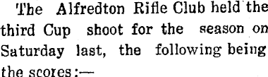 The Alfredton Rifle Club held the third Cup shoot for the season on Saturday last, the following being the scores