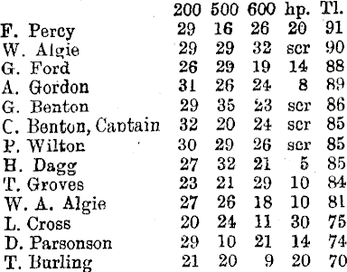 200 500 600 hp. Tl. F. Percy 29 16 26 20 91 W. AJgie 29 29 32 scr 90 G. Ford 26 29 19 14 88 A. Gordon 31 26 24 8 89 G. Benton 29 35 23 scr 86 C. Benton, Cactain 32 20 24 scr 85 P. Wilton 30 29 26 scr 85 H. Dagg 27 32 21 5 85 T. Groves 23 21 29 10 84 W. A. Algie 27 26 18 10 81 L. Cross 20 24 11 30 75 D. Parsonson 29 10 21 14 74 T. Burling 21 20 9 20 70