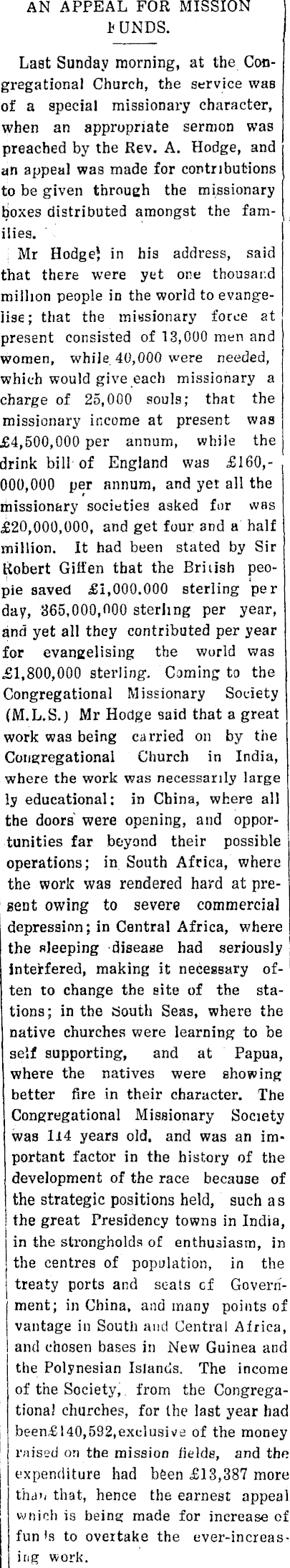 AN APPEAL FOR MISSION *UNDS. Last Sunday morning, at the Congregational Church, the service was of a special missionai*y character, when an appropriate sermon was preached by the Rev. A. Hodge, and an appeal was made for contributions to be given throueh the missionary boxes distributed amongst the families. Mr Hodgej in his address, said that there were yet one thousand million people in the world to evangelise; that the missionary force at present consisted of 13,000 men and women, while 40,000 were needed, which would give each missionary a charge of 25,000 souls; that the missionary income at present was £4,500,000 per annum, while the drink bill of England was £160,000,000 per annum, and yet all the riiissionary societies asked for was £20,000,000, and get four and a half million. It had been stated by Sir Robert Giffen that the British peopie saved £1,000.000 sterling per day, 365,000,000 sterling per year, and yet all they contributed per year for evangelising the world was £1,800,000 sterling. Coming to the Congregational Missionary Society (M.L.S.) Mr Hodge said that a great work was being carried on by the Congregational Church in India, where the work was necessarily large ly educational: in China, where all the doors were opening, and opportunities far beyond their possible operations; in South Africa, where the work was rendered hard at present owing to severe commercial depression; in Central Africa, where the sleeping disease had seriously interfered, making it necessary often to change the site of the stations; in the South Seas, where the native churches were learning to be self supporting, and at Papua, where the natives were showing better fire in their character. The Congregational Missionary Society was 114 years old. and was an important factor in the history of the development of the race because of the strategic positions held, such a s the great Presidency towns in India, in the strongholds of enthusiasm, in the centres of population, in the treaty ports and seats cf Government; in China, and many points of vantage in South and Central Africa, and chosen bases in New Guinea and the Polynesian Islands, The income of the Society,. from the Congregational churches, for the last year had been£l4o,s92,exclusive of the money raised on the mission fields, and the expenditure had been £13,387 more thd»/ that, hence the earnest appeal which is being made for increase of fun's to overtake the ever-increas-irig work.