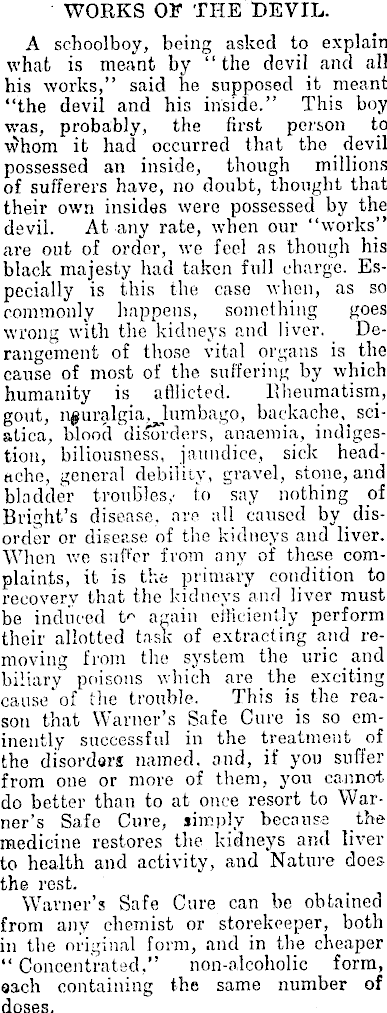 WORKS OF THE DEVIL. A schoolboy, being asked to explain what is meant by "the devil and all his works," said he supposed it meant "the devil and his inside." This boy was, probably, the first person to whom it had occurred that the devil possessed an inside, though millions of sufferers have, no doubt, thought that their own insides were possessed by the devil. At any rate, when our "works" are out of order, we feel as though his black majesty had taken full charge. Especially is this the case when, as so commonly happens, something goes wrong with the kidneys and liver. Derangement of those vital organs is the cause of most of the suffering by which humanity is afflicted. Rheumatism, gout, neuralgia, lumbago, backache, sciatica, blood disorders, anaemia, indigestion, biliousness, jaundice, sick headache, general debility, gravel, stone, and bladder troubles,' to say nothing of Bright's disease, are all caused by disorder or disease of the kidneys and liver. When we suffer from nnv of those complaints, it is the primary condition to recovery that the kidneys and liver must be induced again efficiently perform their allotted task of extracting and removing from the system the uric and biliary poisons which are the exciting cause "of the trouble. This is the reason that Warner's Safe Cure is so eminently successful in the treatment of the disorders named, and, if you suffer from one or more of them, you cannot do better than to at once resort to Warner's Safe Cure, simply because the medicine restores the kidneys and liver to health and activity, and Nature doesthe rest. Warner's Safe Cure can be obtained from any chemist or storekeeper, both in the original form, and in the cheaper " Concentrated," non-alcoholic form, each containing the same number of doses.