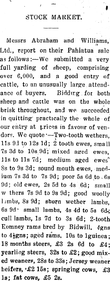 ' "~ ' 'l. STOCK MARKET. Messrs Abraham and Williams, Ltd., report on their Pahiatua sale as follows: —We submitted a very full yarding of sheep, comprising over 6,000, and a good entry of cattle, to an unusually large,attendance of buyers. Bidding, for both sheep and cattle was on tha whole brisk throughout, and we succeeded in quitting' practically the whole of our entry at prices in favour of vendors. We quote-—Two-tooth wethers, lis 9J to 12s Id; 2 tooth ewes, small Is 3d to 10s 9d; mixed aeed ewes, lis to lis 7d; medium aged ewes" 8s to 9s 3d; sound mouth ewes, medium 7s 3d to 7s 9d; poor 5s 6d to, 6s 9d; old ewes, 2s 5d to 4s 6d; small w thers 7s 9d to 9s 9d; good woolly hmbs, 8a 9d; shorn wether lambs, 6s 9d* small lambs, 4s 4d to 5s 6d«; cull lambs, Is 7d to 3s 6d; 2-tooth Eomney rams bred by Bidwill, 4gns to 4Jgns; aged rams. 10s to Iguinea; 18 months steers, £3 2s 6d to £4; yearling steers, 32s to £2; good mixed weaners, 28s to 335; Jersey weaner heifers, °£2 15s; springing cows, £3 Is; fat cows, £5 2s.