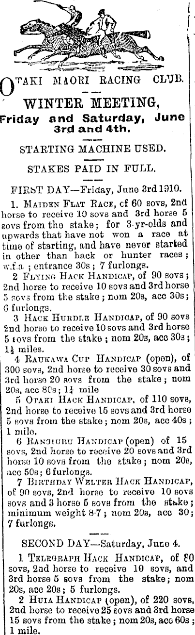 rvTAKI MAORI RACING CLUB. ' WINTEE~ MEETING, Friday and Saturday, June 3rd and 4th. STARTING MACHINE USED. STAKES PAID IN PULL. FIEbT DAY—Friday, June 3rd 1910. 1. Maiden Flat Eace, cf 60 sovb, 2nd horse to receive 10 sovs and 3rd horse 5 govs from tho Btake; for 3-yr-olds and upwards that have not won a race at time of starting, and have never started in other than hack or hunter races; w.t.a ; entrance 30s ; 7 furlongs. 2 Flying Hack Handicap, of 90 sovs; 2nd horse to receive 10 sovs and 3rd horse 5 rsovs from the stake; noin 20s, ace 30s; G furlongs. 3 Hack Hurdle Handicap, of 90 sovs 2nd horse to receive 10 sovs and 3rd horse 5 jovs from the stake ; nom 20s, aco 30s; 1-J miles. 4 Raukawa Cur Handicap (open), of 300 sovs, 2nd horse to receive 30 sovs and 3rd horse 20 sovs f torn the stake ; nom 20s, ace 80s; 1£ mile f» Otaki Hack Handicap, of 110 sovs, 2nd horso to receive 15 sovs and 3rd horee , 5 sovs from the stake; nom 20s, ace 40s ; 1 mile. 6 Ean3 i vnv Handicap (open) of 15 sovs, 2nd horso to receive 20 eovsand 3rd horso 10 bovb from tho ttako; nom 20s, ace 60s; 6furlongs. 7 Birthday Welter Hack Handicap, of 90 sovs, 2nd horse to receive 10 sovs sovs and 3 horso 5 bovb from the Bthke; minimum weight 87 j nom 20a, ace 30; 7 furlongs. SECOND DAY-Saturday, Juno 4. 1 Telegraph Hack Handicap, of 80 sovs, 2nd horse to receive 10 sovs, and 3rd horse 5 sovs from the stake; nom 20s, ace 20s; 5 furlongs. 2 Huia Handicap of 220 sovs, | 2nd horse to receive 25 eovs and 3rd horse 15 sovs from the stake; nom 20s, aco 60s ; 1 mile.