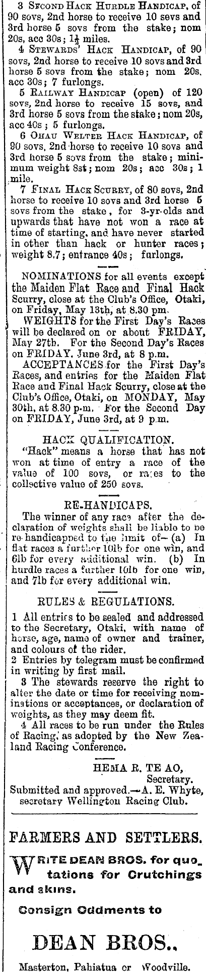 3 Second Hack Hurdle Handicap, of 90 sovs, 2nd horse to receive 10 sevs and 3rd horse 5 sovs from the stake; nom 20s, aco 30s; 1£ miles. j 4 Stewabds' Hack Handicap, of 90 sovs, 2nd horse to receive 10 sovs and 3rd horse 5 sovs from the stake; nom 20s. ace 30s; 7 furlongs. 5 Eailwat HANDicap (open) of 120 sovs, 2nd horse to receive 15 sovs, and 3rd horse 5 sovs from the stake j nom 20s, ace 40s ; 5 furlongs. 6 Ohatt Welteb Hack Handicap, of 80 sovs, 2nd horse to receive 10 sovs and 3rd horse 5 sovs from the stake; minimum weight Bst; nom 20s; aco 30s; 1 .mile. 7 Final Hack Sotbey, of 80 sovs, 2nd horse to receive 10 sovs and 3rd horse 5 sovs from the stake , for 3-yr-olds and upwards that have not won a race at time of starting, and have never started in other than hack or hunter races j weight 8.7; entrance 40s j f arlongs. NOMINATIONS for all events except" the Maiden Plat Race and Pinal Hack Scurry, close at the Club's Office, Otaki, on Friday, May 13th, at 8.30 pmWEIGHTS for the First Day's Races will be declared on or about FRIDAY, May 27th. For the Second Day's Eaces on FEIDAY. -June 3rd, at 8 p.m. ACCEPTANCES for the First Day's Eaces, and entries for the Maiden Flat Eace and Final Hack Scurry, close at the Club's Office, Otaki, on MONDAY, May 30th, at 8.30 p-m. For the Second Day on FEIDAY, June 3rd, at 9 p.m. HACK QUALIFICATION. "Hack" means a horse that has not won at time of entry a race of the value of 100 sovs, or rates to the collective value of 250 sovs. RE-HANDICAPS. The winner of any rac? after the declaration of weights shall be liablo to be re- handicapped to the Jimit of— (a) In flat races a further 101b for one win, and 61b for every additional win. (b) In hurdle races a further 101b for one win, and 71b for every additional win. RULES & REGULATIONS. 1 All entries to be sealed and addressed to the Secretary, Otaki, with name of horse, age, name of owner and trainer, and colours of the rider. 2 Entries by telegram must be confirmed in writing by first mail. 3 The stewards reserve the right to alter the date or time for receiving nominations or acceptances, or declaration of weights, as they may deem fit. 4 All races to be run under the Rules of Eacing,' as adopted by the New Zealand Racing Conference. HEMA E. TE AO, Secretary. Submitted and approved.—A. E. Whyte, secretary Wellington Eacing Club. FARMERS AND SETTLERS. "TTTRITE DEAW BROS, for quo. ** tations for Crutchings and skins. Consign Oddments to DEAN BROS.. Masterton, Pahiatua or Woodville.