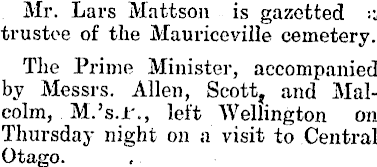 Mr. Lars Mattson is gazetted :; trustee of the Mauriceville cemetery. The Prime Minister, accompanied by Messrs. Allen, Scott ? and Malcolm, M.'s.±\, left Wellington on Thursday night on a visit to Central Otago.