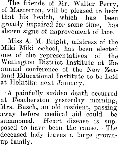 The friends of Mr. Walter Perry, of Masterton, will be pleased to hear that his health, which has been greatly impaired for some time, has shown signs of improvement of late. Miss A. M. Bright, mistress of the Miki Miki (school, has been elected one of the representatives of the Wellington District Institute at the annual conference of the New Zealand Educational Institute to be held at Hokitika next January. A painfully sudden death occurred at Featherstou yesterday morning, Mrs. Busch, an old resident, passing away before medical aid could be summoned. Heart disease is supposed to have been the cause. The deceased lady leaves a large grownup family.