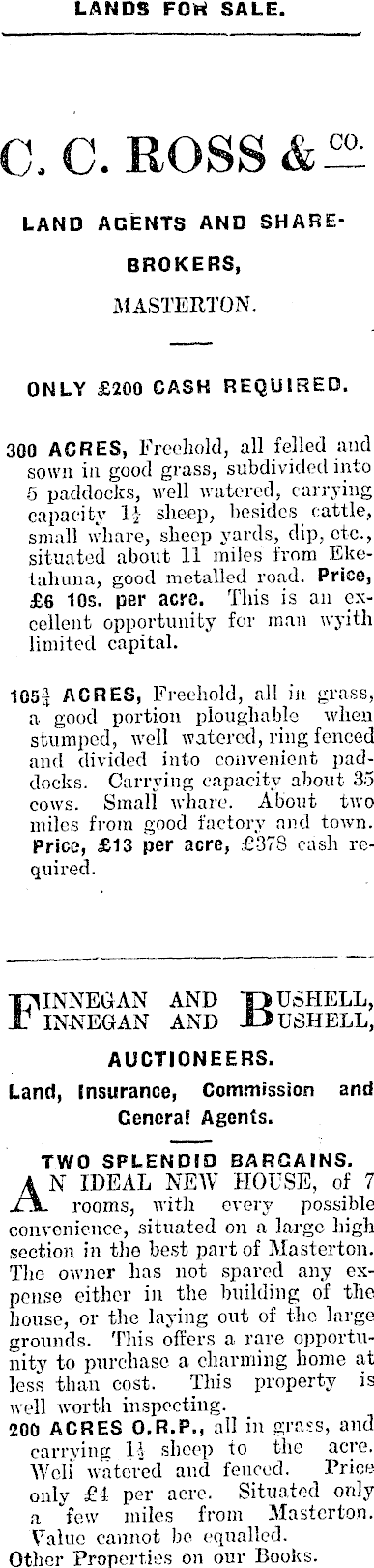 LANDS FOrt SALE. C. C. ROSS & LAND AGENTS AND SHAREBROKERS, MASTERTON. ONLY £2OO CASH REQUIRED. 300 ACRES, Freehold, all felled and sown in good grass, subdivided into 5 paddocks, well watered, carrying capacity sheep, besides cattle, small wliare, sheep yards, clip, etc., situated about 11 miles from Eketaliuna, good metalled road. Price, £6 10S. per acre. This is an excellent opportunity for man wyith limited capital. 105| ACRES, Freehold, all in grass, a. good portion ploughable when stumped, well watered, ring fenced and divided into convenient paddocks. Carrying capacity about- 35 cows. Small whare. About two miles from good factory and town. Price, £l3 per acre, £378 cash required. FINNEGAN AND "OUSHELL, INNEGAN AND -OUSHELL, AUCTIONEERS. Land, Insurance, Commission and Genera* Agents. TWO SPLENDID BARGAINS. An ideal new house, of 7 rooms, with every possible convenience, situated on a large high section in the best part of Masterton. The owner has not spared any expense either in the building of the house, or the laying out of the large grounds. This offers a rare opportunity to purchase a charming home at less than cost. This property is well worth inspecting. 200 ACRES 0.R.P., all in grass, and carrying li sheep to the acre. Well watered and fenced. Price onlv £4 per acre. Situated only a "few miles from Masterton. Value cannot be equalled. Other properties on our Books.