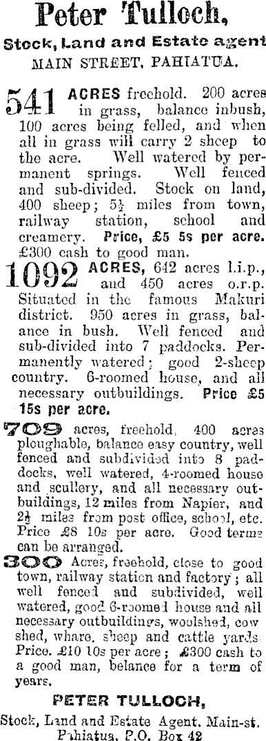 Peter Tulloch, Stock, Land and Estate agent MAIN STREET, PAHIATUA. ACRES freehold. 200 acres in grass, balance inbush, 100 acres being felled, and when all in grass will carry 2 sheep to the acre. Well watered by permanent springs. Well fenced and sub-divided. Stock on land, 400 sheep; 5J miles from town, railway station, school and creamery. Price, £5 5s per acre. £3OO cash to good man. i AQO ACRES, 642 acres 1.i.p., 1U and 450 acres o.r.p. Situated in the famous Makuri district. 950 acres in grass, balance in bush. Well fenced and sub-divided into 7 paddocks. Permanently watered; good 2-sheep country. 6-roomed house, and all necessary outbuildings. Price £5 15s per acre. 709, acres, freehold, 400 acras ploughable, balance easy country, well fenced and subdivided into 8 paddocks, well watered, 4-roomed house and scullery, and all necessary outbuildings, 12 miles from Napier, and 2$ miles from post office, sclio?!, etc. Price 10s per acre. Good terms can be arranged. 3QO Acre?, freehold, close to good town, railway station and factory ; all well fenced and subdivided, well watered, good 6-roomei house and all necessary outbuildings, woolshed, cow shed, whare. sheep and cattle yards Price. £lO 10s per acre ; i! 300 cash to a good man, belance for a term of years. PETER TULLOCH, Stock, Land and Estate Agent. Main-st. Pihiatus, P.O. Box 42
