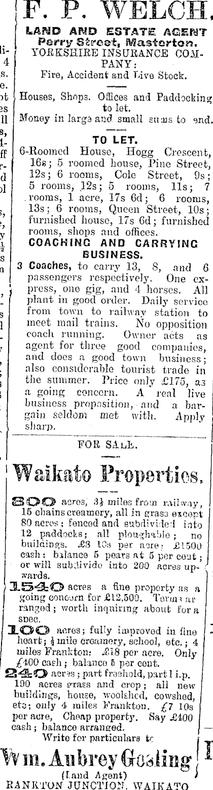 F. P. WELCH. LAKJD AMD ESTATE AGEKST Perry Street, Mastertcm. YORKSHIRE INSURANCE COMPANY: Fire, Accident and Tiive Stock. Houses, Shops. Offices and Paddocking to let. Money in larga and small sums to end. TO LET. 6-Roomed House, Hogg Crescent, 16s; 5 roomed house, Pine Street, 12s; 6 rooms, Cole Street, 9s; 5 rooms, 12s; 5 rooms, lis; 7 rooms, 1 acre, 17s 6d; 6 rooms, I 13s; 6 rooms, Queen Street, 10s; ! furnished house, 17s 6d; furnished rooms, shops and offices. COACHING AND CARRYING BUSINESS. 3 Coaches, to carry 13, 8, and 6 passengers respectively. One express, one gig, and 4 horses. All plant in good order. Daily service from town to railway station to meet mail trains. No opposition coach running. Owner acts as agent for three good companies, and does a good town business; also considerable tourist trade in the summer. Price only £175, a3 a going concern. A ' real live business proposition, and a bargain seldom met with. Apply s sharp. FOR SAIE. ~ ~ Waikato Properties. 800 acres, 3J miles from railway, 15 chains creamery, all in grass except 80 acres ; fenced and subdivide;! into 12 paddocks; all plougbable ; no buildings. .£3 ICs per aare? £ISOO cash; balance 5 pears at S per cent; or will sub;Uvido into 200 acres up-' wards. 3LS4:O acres a fine property as a going concjrn for £12,500. Torm-i ru- [ ranged j worth inquiring about for a stiec. 100 acres; fully improved in fine heart; ij mile creamery, school, etc.; 4 miles Frankton: iliß per acre. Only £IOO cash; balanco 6 per cent. 240 acra; part frashold, part 1 i.p. 190 acres erass and crop; all new buildings, house, woolshed, cowshed, | eto; only 4 miles Frankton. £7 10s por acre, Cheap property. Say .£IOO cash •, balance arranged. | - Write for particulars to j Vv in. Aubrey Gosling (Land Agent) / RANRTON JUNCTION. WAIKATO