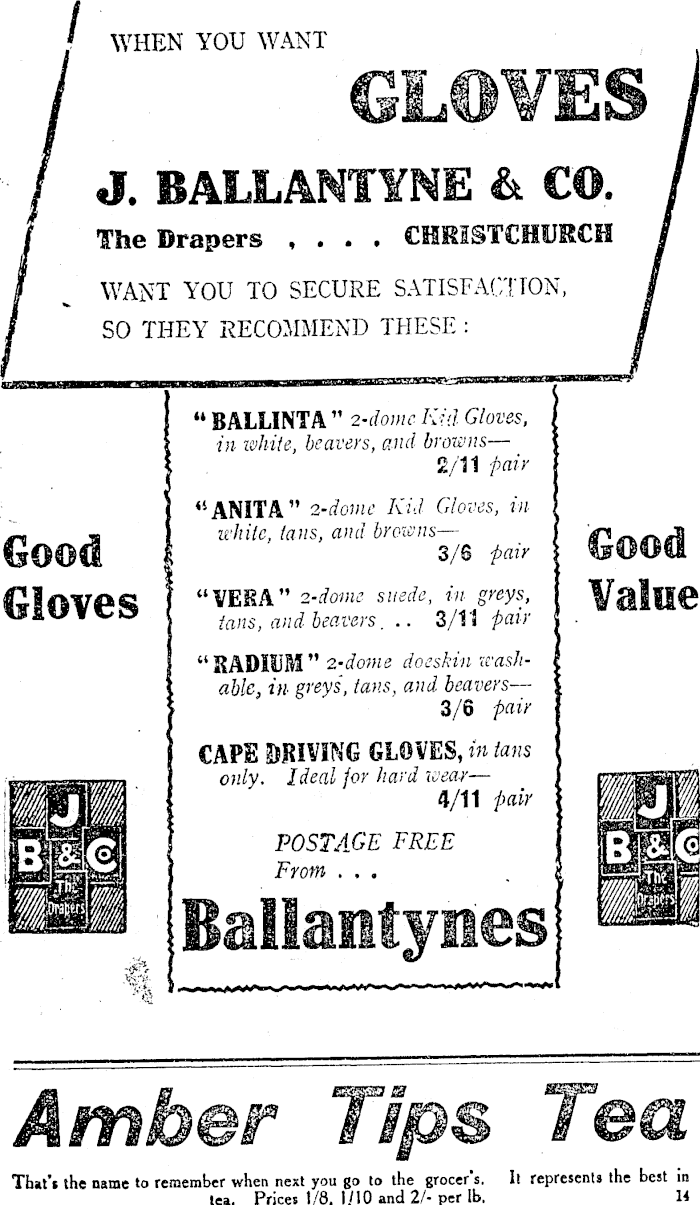 WHEN YOU WANT GLOVES J. BAUANTYNE & CO. The Drapers , . • * CHRISTCHURCH WANT YOU TO SECURE SATISFACTION, SO THEY RECOMMEND THESE : Good Gloves ijlf B®€! "BALLINTA" 2-dome Kid Gloves, in white, beavers, and browns — 2/11 -pair "ANITA" 2'dome Kid Gloves, in while, tans, and browns — 3/6 fair "VESA" 2-dome suede, in greys, iaiis, and beavers. .. 3/11 fair "RADIUM" 2-dome doeskin :washable, in greys, tans, and. beavers — 3/6 fair CAPE DRIVING GLOVES, in tans only. Ideal for hard wear — 4/11 fair POSTAGE FREE From ... Ballantynes Amber Tips Tea That's the name to remember when next you go to the grocer s. It represents the best in tea. Prices 1/8, 1/10 and 2/- per lb. 11