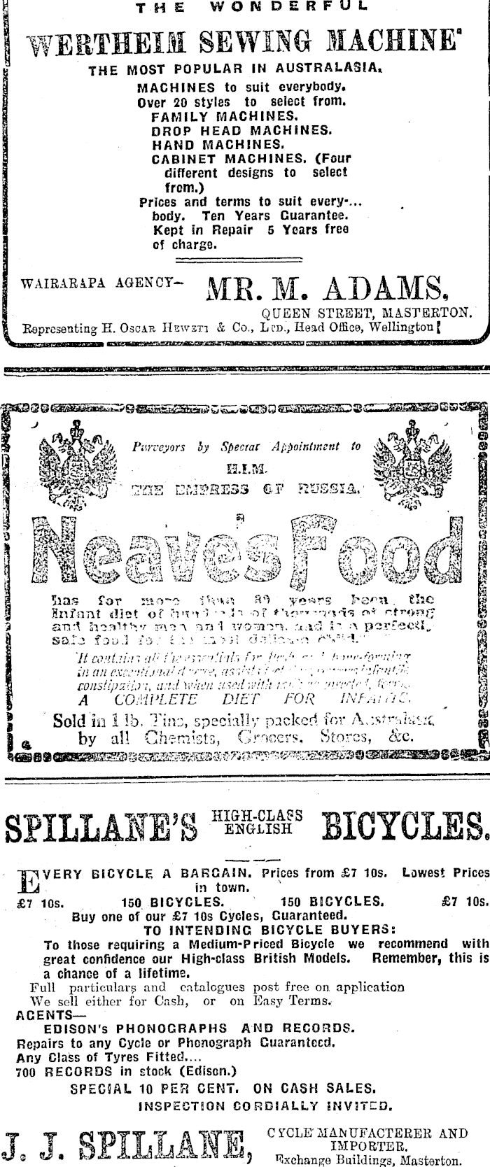 THE WONDERFUL WERTHEM SEWING MACHINE' THE MOST POPULAR IN AUSTRALASIA* MACHINES to suit everybody. Over 20 styles to select from. FAMILY MACHINES. DROP HEAD MACHINES. HAND MACHINES. CABINET MACHINES. (Four different designs to select from.) Prices and terms to suit ever]/-... body. Ten Years Guarantee. Kept in Repair 5 Years free of charge. WAIRARAPA AGENCY— M# ADAMS, QUEEN STREET, MASTERTON. Representing H. Oscar Hewsti & Co., Ltd., Head Office, Wellington J ," I 1 Purveyors by Spectar Appointment to H.I.M. 7ns ©? Russia, m§ m fam MM $ Sias for nvr»~o 1 Vms JW ' ye«rs J^s^n. the Hnfnnt diet of o■-"t 1■ v! of * V?" o* r.t^on^ ani hi.r>itv»v jni A r i'i "1 v/o"jm. .-a por'ecsl^ sal'j foo.l fo: >"i! w-i." 'lt Co!it.ii:i~ it I' i'ie f>" t'r, -• ' h-v't'.fo^:;riy in an cxc:->!i.> : ia ! -t mv?{; f ••••; t-ifr'i'K coiistipziiri, and W'hi'n used with tr.>."" ■, firA COMPLETE DIET FOR INfsU.jC. 9 Sold in 1 lb. Tins, specially packed for /V;s*rhkszc | t by all Chemists, Grocers, Stores, &c. J SPILLAIE'B HI&H-CLASS ENGLISH BICYCLES. EVERY BICYCLE A BARGAIN. Prices from £7 10s. Lowest Prices in town. £7 10s. 150 BICYCLES. 150 BICYCLES. £7 10s. Buy one of our £7 10s Cycles, Guaranteed. TO INTENDING BICYCLE BUYERS: To those requiring a Medium-Priced Bicycle we recommend with great confidence our High-class British Models. Remember, this is a chance of a lifetime. Full and catalogues post free on application We sell either for Cash, or on Easy Terms. AGENTS—EDISON'S PHONOGRAPHS AND RECORDS. Repairs to any Cycle or Phonograph Guaranteed. Any Class of Tyres Fitted.... 700 RECORDS in stock (Edison.) SPEGSAL 10 PER CENT. ON CASH SALES. INSPECTION CORDIALLY INVITED. J"W riTVFT 1* A "WTO C rCLE'MAISiUFACTERER AND T KrfLljAJfM importer. o «J • O-fi. Exchange Buildings, Masterton.