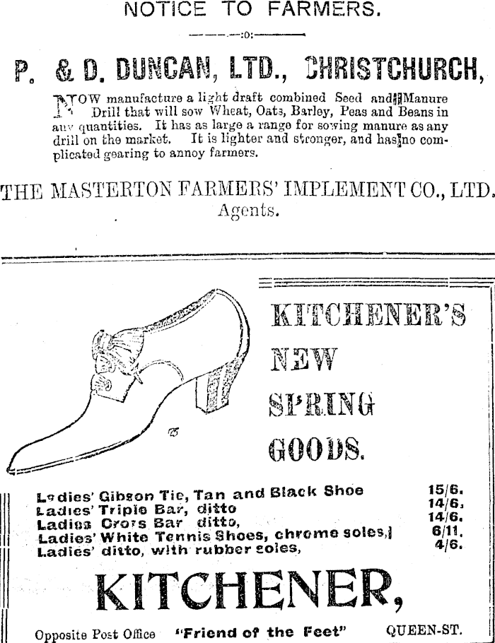 NOTICE TO FARMERS, P. &D. DUNCAN, LTD., 3HRISTCHURCH, TVY"OW manufacture a light draft combined Seed andjptanure A*' Drill that will sow Wheat, Oats, Barley, Peas and Beans in anv quantities. It has as large a range for sowing manure as any drill on the market. It is lighter and stronger, and has]no complicated gearing to annoy farmers. THE MASTERTON FARMERS' IMPLEMENT CO., LTD. Agents. V.'i J KITCHENER'S ISW SPRING GOODS. Ladies' Gibson Tie, Tan and Black Shoe Ladies' Triple Bay-, ditto Ladies Grors Bar ditto, » Ladies' White Tennis Shoes, chrome soles,j Ladles' ditto, with rubber soles, 15/6. 14/6, 14/6. 6/11. 4/6. Opposite Post Office "Friend of the Feet" QUEEN-ST.