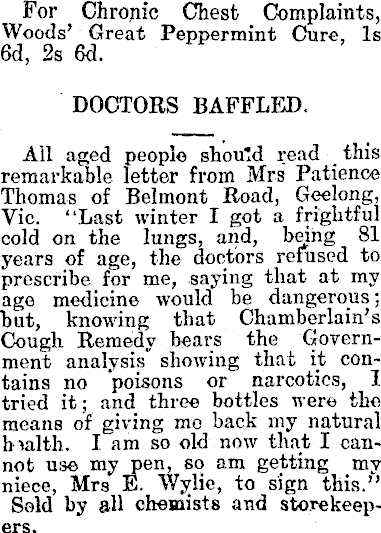For Chronic Chesfc Complaints, Woods' Great Peppermint Cure, Is 6d, 2s 6d. DOCTORS BAFFLED. All aged people shouTd read this remarkable letter from Mrs Patience Thomas of Belmont Road, Geelong, Vic. "Last winter I got a frightful cold on the lungs, and, being 81 years of age, the doctors refused to prescribe for me, saying that at my age medicine would be dangerous; but, knowing that Chamberlain's Cough Remedy bears the Government analysis showing that it contains no poisons or narcotics, I tried it; and three bottles were the means of giving mo back my natural health. lam so old now that I cannot use my pen, so am getting my niece, Mrs E. Wylie, to sign this." Sold by all chemists and storekeepers.