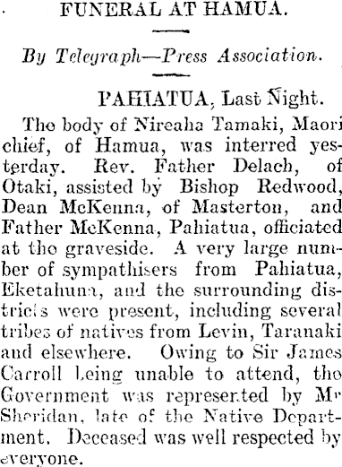 FUNERAL AT HAMUA. By Telegraph — Press Association. PAHIATUA. Last Night. The body of Nireaha Tamaki, Maori chief, of Hamua, was interred yesterday. Rev. Father Delach, of Otaki, assisted by Bishop Redwood, Dean McKenna, of Masterton, and Father McKenna, Pahiatua, officiated at the graveside. A very large number of sympathisers from Pahiatua, Eketahuna, and the surrounding districts were present, including several tribes of natives from Levin, Taranaki and elsewhere. Owing to Sir James Carroll being unable to attend, the Government was represented by M<Sheridan, late of the Native Department. Deceased was well respected by everyone.