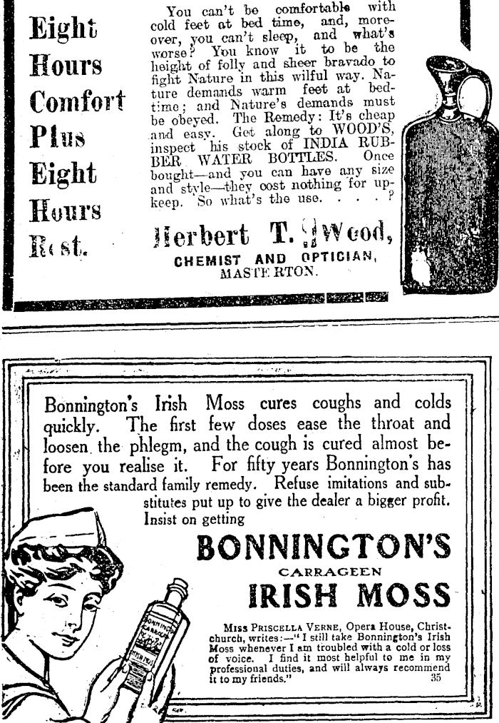 You can't b© comfortabk with cold feet at bed time, and, moreover, you can't sleep, and what a worse? You know it to be the height of folly and sneer bravado to fitrht Nature in this wilful way. JNature demands warm feet at bedt;me; and Nature's demands must be obeyed. The Remedy: It's, cheap and easy. Get along to■ WOODb, inspect his stock oi INDIA RUBBER WATER BOTTLES. Once bought—and you can have any size and stvle—they cost nothing for upkeep. 'So what's the uee. . . • r Herbert TVjWood, CHEMIST AND OPTICIAN, MASTERTON. | Bonnington's Irish Moss cures coughs and colds quickly. The first few doses ease the throat and loosen, the phlegm, and the cough is cured almost before you realise it. For fifty years Bonnington's has been the standard family remedy. Refuse imitations and substitutes put up to give the dealer a bigger profit. *"-" - ~' J i Insist on getting ;TO vlHin7vhrlf Miss Priscella Verne, Opera House, Christehurcb, writes:—"l still take Bonnington's Irish Moss whenever I am troubled with a cold or loss of voice. I find it most helpful to me in my professional duties, and will always recommend it to my friends." 35