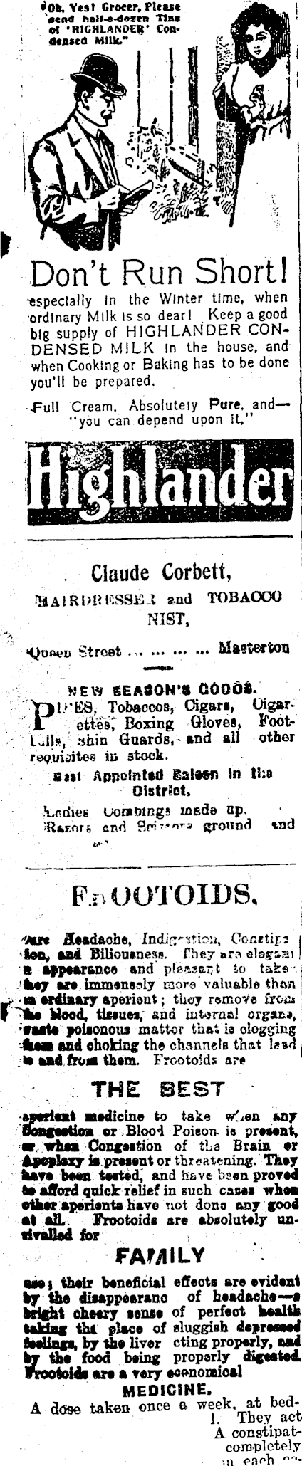 • Ok. Vest Grocer. Please '•end half-a-donn Tina Ot 'HIGHLANDER' Cpßdejued Milk." Don't Run Shortl •especially In the Winter time, when •ordinary Milk Is so dearl Keep a good big supply of HIGHLANDER CONDENSED MILK in the house, and when Cooking or Baking has to be done you'll be prepared. -Full Cream. Absolutely Pure, and—"you can depend upon it," Claude Corbett, i&AIRL>KKSS£-i *nd TOBACCO NIST, •Qoften Street - ... Masterton NEW SEASON'S GOOD*. ,I>*EB, Tohaocoß, Oigara, Cigar- . Boxing Gloves, PootLJls, afain Guards,- end -all otter reouiaites io stock. sait Appointed ealwn In the District, uonwngs wsde np. 'Rw.nrs end SH-*i r » ground *nd FnUOTOIDS, "Mn ileadaehe, indis'sticii, Coartirs aad Biliousness, They *ra dogs-ai B appearance and" pleasw;t to take-. twj m immensely more valuable then m erdiaary aperieut; they remove fires* state poisonous matter thai « clogging 4hea and choking the channels that l*»d :*» eadfroal (ham. Frootoids are THE BEST edieine to take any ; or Blood Poison- is present, /wtoa Congestion of tLa Brain er Apoplexy ia present or threatening. They fcave bean tested! and have bsen proved •a afford quick relief in such casts whoa ellw aperients have not dona any good •• eIL Frootoida are absolutely unfivaßed fee FAMILY aaai thair banefioial effects are evident by the diaappaarano of headache—a night cheery sense of perfect health taking thl place of sluggish daprasase* feelings, by the liver cting properly, and the food being properly dictated. "" i are a very economical MEDICINE. A dose taken once a bed^ A constipat- . completely