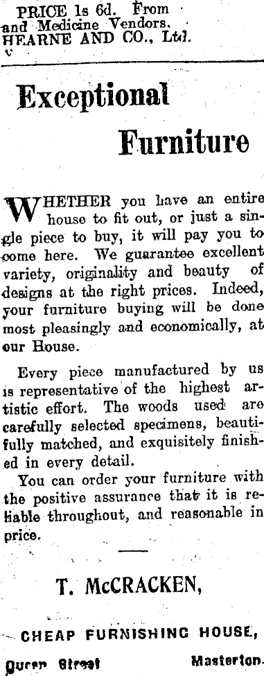 PRICE Is 6d. From • and Medicine Vendors. . HTCATINE AND CO., Ltd. v • "TfTHETHER you Lave an entire rV house to fit out, or just a single piece to buy, it will pay you to ioome here. We guarantee excellent variety, orignialiity and beauty of designs at the right prices. Indeed, your furniture buying will be done most pleasingly and economically, at our House. Every piece manufactured by us is representative of the highest artistic effort. The woods used are carefully selected specimens, beautifully matched, and exquisitely finished in every detail. You can order your furniture with the positive assurance thai? it is reliable throughout, and reasonable in t. Mccracken, CHEAP FURNISHING HOUSE, JJOffT* Btf99t Master ton-