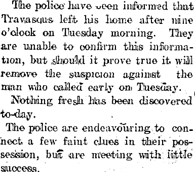 T(he police 1 have x-een informed that Traviasqus- left his lioone after nine o'clock on Tuesday morning. They are unable to confirm this information, but .slbou-ld it prove true it will remove tike sM&picion agaimsit the man wiho oalilea early oni Tuesuay. Nothing fii'e slk htas been discovered to-<lay. The police are endeavouring to connect a few faint clues in their possession, butt are meeting with; little sjuocess.