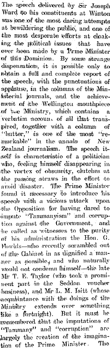 The. -speech dtalwetred iby Sir Jiaseip'h Ward #o Qiis eonstitueinits. at Wanton was joine. of tOne most dialing Jatitemipts at bewildering tflie pdbllic-', and ©nie of the mosit desperate leffbrts at cloaking tliie pjdltiitdciail isismes; that have over iheen made by /a ?d'ine Minister of tlhlis Dominion. By soemle strange diispeiiaatiiioih', it lis possible onily to obttaim a ifaiM. and complete report of the speech', with tine punctuations of nppi!ialus£, in. tlie calumns of tlile MinSiSteri/al journals, and the aoliiievemiietrit of (the Wefliliugtou .mouthpiece oif taie Ministry, wthiicth. .containis a verbatim laooouiu of all that transpired', togetibJeir wiith a eolumuni of "butter," ds> one of the most "a-e----inisiirkaifole" in the: annate of JS'iew Zealand journalisim. Whse speedh itiseflf is. cihiairaatetriisibio of a (poilitioiam wjio, feeHing hiimlselif disappearing in tlhe virartex of obsGUiiuty, clutches at the paiSislmg (straws in- tlie effort to avoid '"disaster. T(lie Prime Minister found lit nleoessary to introduce liis ispeeab with .a vicious lattack upon til tie Opipoißiition for (having dared to limiiniito ' 'Taminiianyii smi'' and corruption against tlhe Gioveuiivnuenit, and be called n,s 'wiitnessies to the purity of his adminisitratioTii the Hon. G. I'W-lds—who .recently isK« , a.mibli&d out of Itlhie Cabin et in as dignified a miana\er as .possibliey and wiho iva.tiui-a.llv would >not oonde.miii Ihsmiselif—-tlie late Mir T. E. Taylor (who took a- prominenft part in- the Seddon. voucher ihuisiness.), and Mir L. M. Isitt (wlhose (acquaintance with the- doings of the Mri,nn"i.story extendis over something Jike a fTraifciiigfht). But it must be inpimiemlbered, rthlat the imputations of • "Ta.mimn.ny" and "corruption." arc .'Jiaa-gely 10 '?i'«a^ oTl of * ne imwgiiiiation of the Prime Minister. The