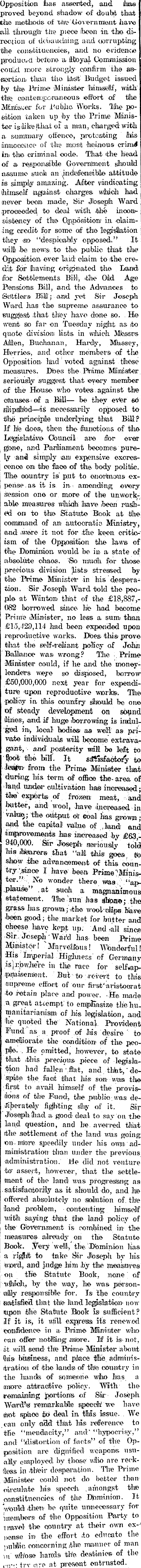 Opposition has assented, and. has proved beyond shadow of doubt that tihe mietlhods of tn>e'Government have ail through- tire piece (bean in the direction of dcfuaiuMng and ooirrupting tihe comsibituiuaicaes, aaid no edden-cje produc-ct before a ißloyal, Ootmjmissdon cou'ijcl. wore strongly confirm 'the ais<ae<rtion, than tJho last' Budget issued by the Prime Minister himseflf, with the. ciojiten-.teoraji-eous effort of the Mtntisitea- for Public Wtoorks. llhe position taken up by the Prime Minister ig like (that of a man, charged' with a- summary offence, pfrctesiting finis inaLOoeiiice of the most heinous crinid im tlue criminal oode. That the head of a .responsible Govecrntoent should assume such an indiefenisabflje attitude is simply amazing. After vindicating (himself lagainst chargeis, wthdcJi had never been: made, Sir Jbseplh. Ward proceeded to deal wiitih .the inconsistency of the Opposition/ hi diaim.ing credit for some of the Jegjrsfllation they (Sto "de&pkiabl.y opposed.." It wiiliL .be news, to the public that the Opposition, over hi id claim to rthe ered'lit fkxr having originated the Land ifioor Settlements Bill, the Oild Age Bemsiiows Bill, and the Adivances to ; ©dttleirs B'iiffi ; .and yet Sir Joseph I Ward has the supreme assurance to suggest that they have done so. . He went so far on Tuesday wight as. ito quote division! Mats in which Mleissms Allien, Buchanan, Hardy, Mlassey, Harries., and other me.mber& of the Opposition, liiad voted against tlheise meaisaires. Does the-.Frame Miinii.sfteir | seriously suggest that every memiber of tlie House who votes, against the j otaUises.' of a Bail— be they ever so rilipEfliod—i£ necessarily opposed to tflwj principle underlying that Bill? If He does, then the fhirootions of tilieLeigislativiG Council are. ior ever gone, and Parliament becomes purely and- simply tain expensive exicrescenoe on the face of the body politic. Tihe oauntry is' put to euorimoais expense, as it is in.. amending every session one or more of the unworkable measures whicjb have been rushed oni to the Statute Book at the : comimand of an autocratic Ministry, a.nd .were it not for the keen critic-' ism of the Oppasitiio\ii the laws of tihe Dominion, would be in a state of absolute chaos. 'So much, for tlitose precious division lists stressed by the Frimie Minister in his.desperation. Sir Joseph Ward told the people at Wlinton. that of tike £18,887,082 borrowed since lie had become Prime Minister, no less a sum than £l-5,429,114 had been expended upon works. Does, -this prove timt tine self-reJaant policy of John BaUance was wrong ? The- Prime •Minister could, if he and the moneylenders wiere so disposed, borrow £•50,000,000 next year for expenditure 'Upon reproductive works. The poM-cy in this counfry should be one of steady dewioptmeiiit on sound lines, and if huge (borrowing is indulged in, local bodies) as well as private individuals will beconxe extravagant, and posterity wall be left to ' Ijooit the bil!f. It to •.fe#n- from the Prim© Minister that during lids term of offiae the- area of land undiea" cultivation has increased; the exports of frosrero meat, and butter, and wool, have lincrmsed in value;; the oikput olr coal h/as growm; and the capital value of ~land and limjprovomejiis has increased by £63,940,000. Sir Jioseph aariously told Ms ihea<rers that "all this goes, to show the advancement of this country >inee I have been Prime IMinister.^' ■-. No wonder there w&s/ "ap.plauie" .at such a magnanimous statement. The 'sun has dfopoe; the grass lias grown; the wool-daps hlave been good; the market for butter and ob.eeselia.vo kept up: And-all since Sir,Joseph'Wai'd has. been Prime Miiiidstorl "Marve;lJous! His 'inyperial HigWss of Gwrnahy .is}r|ow,hiere in tlie race for selfwai>-' ipijaisemlent. But to ,revert to this 'Siupreme effiort of our first-'ai-istoorat to TOtain place ami power. Jle made .a. great attempt to empHjaisize theliumanitarianiism of luis legisiLation, and he quoted the National. Provtident Fund as a pa-oof of lias dlesire ' to ameliorate tlie condition' of the people. . He omitted, however, to sit-ate that this precious piece of legislation had fallen "flat, and tlibt," despite the fact tiliat Ms son- wiais the : first to avail himself of tlie provisions of the Fund, the public.was deJJiberateHy figlhting shy of it. Sir Joseph (bad a good deal to say on the land question, and he. averred tliat. tthe .settlement of the land was going on. more speedily under his own admimiistration tlian undter the previous administration!. He did not venture •to" asseit, however, that the settlement of the land was progreslang as . satislfia«to.viily as it should do, and he ofrered absolutely no soOaition of. tli'e Hand problem, • contenting himself with saiyiing that thie land policy of the (JoT'iern.ment is romhined in the mea*ur©s already on the- Sita.tu.te Book, yiery weal, the Dominion lias a to take Sir Joseph by his word, and judge him by the lneakiras. on th'e- Statute Book, none; of vinnioli,, by the way, he wias person(aMy reisponsjibfle for. Is- the country Satisfied that the- hind legislation- now upon the Statute Book is sufficient ? If it is, it wiill express its renewed 'coiifidence in a- Puime MHniater who can offer notliMig onloa-e. If it is> not, at will -send' the Frame Monaster about Ma business, and pilace tsie adminisiti'atioai of -the lands of tUite country in the luandls of someone who lias a nnore atta'aotive policy. With the remaining portions of Sir Joseph Wiard'is' rennarkaliile speech 1 we have not spiaoe ik> deal in this issue. . We can only add thlat his a-etferencie to tlie "mendacity," and" "hypocrisy," and "distortion of facts" of tlie Opposition are dignified wcaponis usually employed by .those wflio nre recktlless in -their despea-a.tion. Tlie Frime Minister could not do better than circulate his ■speech, . amongst tlue constitue-noies of the Dominion. It Wuildi them he quite unne