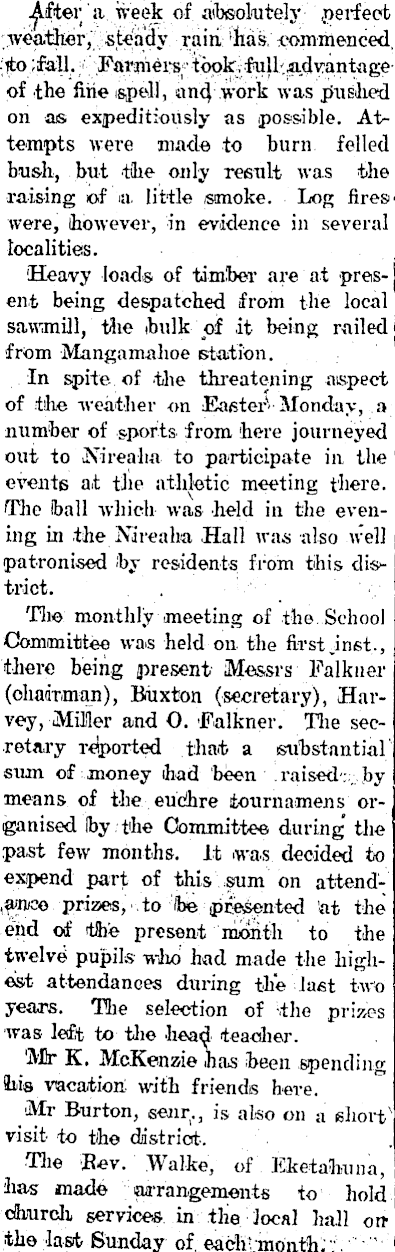a week of absolutely perfect i weather, steady rain, 'has, commenced,j ?to ;£all. Fawners;' of the fine spell, and work was pushed on as expeditiously as possible. Attempts were made to burn felled bush, but the only result was the raising of a. little smoke. Log fires* were, however, in evidence in several localities. 'Heavy load® of timber are at present being despatched from the local sawmill, the hulk of it being railed from Mangamahoe Btaition. In spite of the threatening aspect of the -weather on Easter 4 - Monday, a number of sports from here journeyed out to Nireaha to participate in the events at the athletic meeting there. The iball -which was held in the evening in the Xi realm Hall was also well patronised <by residents from this dis>trict. . The monthly meeting of the . School Committee was held on. the first.inet., there being present Messrs Falkuer (chairman), Buxton (seci-etary), Harvey, Miller and O. Falkner. The secretary reported that a substantial' sum of money had been . raised :., by means of the euchre iournamens organised Iby . the Committee during' the past few months. It was decided to expend part of this sum on attend..a<nee prizes, to ibe presented at the end of the present month to the twelve pupils who had made the highest attendances during the last two years. The selection of -the prizes was left to the head teacher. 'Mr K. McKenzie has ibeen spending Ill's vacation: with friends here. ■Mr Burton, senr., is also on a short' visit to the district-. •The Rev. Walke, of Eketahuna, has made aa-rangements to hold church services in the local hall onthe last Sunday of. eaclilmonth.'"