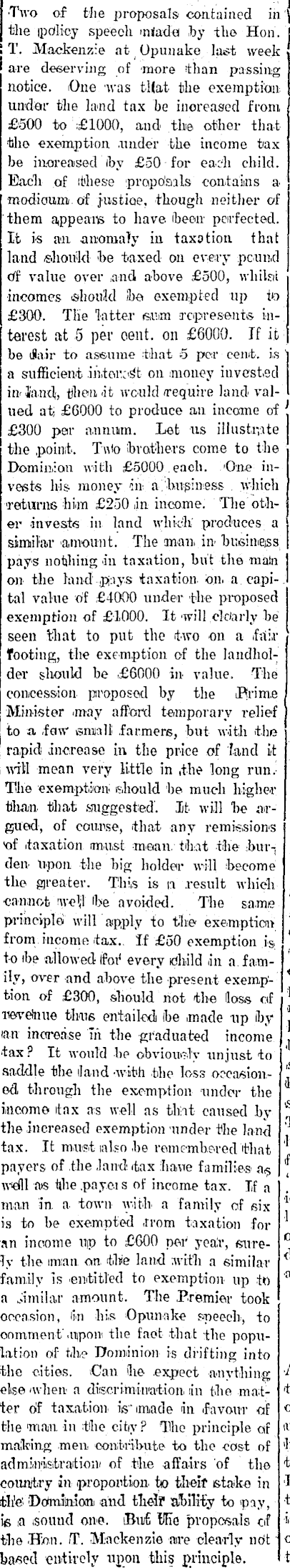 •Two of the proposals contained in' the ipolicy speech >niada toy the Hon. ST. Mackenzie at Opunake last week ' are deserving of more than passing notice. One was tllat the exemption under the land tax be increased from £SOO to £IOOO, and the other that ■the exemption .under the income tax be inoreaised ibv £SO for each child. Each of ifcliese proposals contains a modicum, of justiae, though neither of 'them appears to have, ibeen pcirfected. It is aai anomaTy in taxation that land should fee taxed on every pound c/f value over ,and above £SOO, whilst incomes <shoukl )be exempted up to £3OO. Tlie latter mm represents interest at 5 per cent, on £6OOO. If it j be ifla.ir to assume that 5 per cent. i,s ' a sufficient .intercut on money invested iniandi, tjhen, .it would /require land valued at; £6OOO to produce an income of ' £3OO par annum. Let -us illustrate the .point. Tnk> brothers come to the Dominion with £sooo,each. 'One invests his money m al'bupiness , which 'returns 'him £250 in income. The other invests in land which' produces a similar 'amount. The <man> in- business pays nothing an taxation, but the main on the land ,pj:iys taxation, on. a capital value <rf £4OOO under the proposed exemption of £IOOO. It 'will cldarly be seen that to put the two on a fair footing, the exemption of the landholder should be £6OOO in. value. The concession proposed by the ißrirne , Minister .may afford temporary relief to a ,faw smialii .farmers, but with the ! rapid increase in the price of land it . will mean very little in ,the long run. The exemption should be much higher tlian. that suggested'. It will be argued, of course, that any remissions •of (taxation nrwist mean, that the ibur-j den Upon the big holder will become the greater. This is n result which •cannot 'we l ;! ibe avoided. The same principle will apply to the exemption | from income tax.. If £SO exemption is to ibe allowed Ifot' every Child in a, family, over and above the present exemption of £3OO, should riot tlie loss cif iwetnue time entailed (be .made up iby lan increase In the graduated income tax? It would be obviously unjust to saddle the iland -with the loss occasioned, through the exemption under the income itax as well as that caused by the increased exemption 'under the land tax. It must lalso .be remembered that payers of the .land ifcax liavte families' a$ wefll as ilhe .payei sof income tax. If a man in. a town with a family of six is to be exempted ,trom taxation for an income up to £6OO per yeair, sure•Tv the imian on. the land with a similar family is entitled to exemption up tti a similar amount. The Premier took occasion, lin his Opunake speech:, to oommenf .uiponi the fact that the population of the Dominion is drifting into the cities. iCan ilie .expect anvthiiig else when a discrimination, in the matter of taxation is'imade in (favour of the mam. in the citiv ? The principle of making men contribute- to the cost of admiiirisitraitioin of the affairs of the country in proportion, to theif stake in ifch'e' Dominion aiid tlieif ability to pay, is ,a isound one. ißu£ URe proposals of the Hon. iT. Mackenzie are clearly n6t based entirely upon this principle.