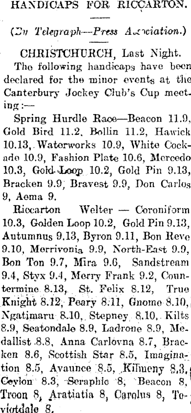 HANDICAPS FOR RICCARTON. (Uv TeUgraph—Press A^iciatian.) CHRISTCHURCH, Last Night. The following handicapg have been declared for the minor events at the Canterbury Jockey Club's Cup meeting:— Spring Hurdle Race—Beacon 11.9, Gold Bird 11.2. Bollin 11.2, Hawick I 10.13, Waterworks 10.9, White Cock- | ado 10.9, Fashion Plate 10.6, Mcreedo 10.3, Gold Jboqp 10.2, Gold Pin 9.13, I Bracken 9.9, Bravest 9.9, Don Carlos I 9, Aema 9. I Riccarton Welter Coroniform 10.3, Golden Loop 10.2, Gold Pin 9.13, Autumnus 9.13, Byron 9.11, Bon Revo 9.10, Merrivonia 9.9, North-East 9.9, j Bon Ton 9.7, Mira 9.G, Sandstream . 9.4, Styx 9.4, Merry Frank 9.2, Countermine 8.13, St. Felix 8.12, True! Knight 8.12, Peary 8.11, Gnome 8.10, j Ngatjmaru 8.10,, Stepney 8.10,. Kilts ] 8.9, SeatondaJe 8.9, Ladrone 8.9, Medallist .8.8, Anna Carlovna 8.7, Bracken 8.6, Scottish Star 8.5, Imagination 8.5, Avaunce 8.5, JPtiTmeny 8.3, i Ceylon 8.3, Seraphic 8; Beacon 8, Troon 8 f Aratiatia 8, Carolus 8, To- ] viotdale 8, ■
