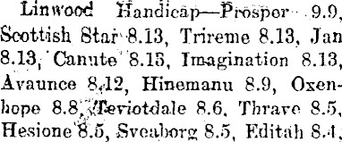 Lin wood Handicap—Prosper 9.9, Scottish Star-8.13, Trireme 8.13, Jan 8.13, Canute' 8.13, Imagination 8.13, 'Avaunce Hinemanu 8.9, Oxenhope B.B3Eeviotda.le 8.6. Tbrave 8.5, Hesione'B.s, Svea-borg 8.5, Editah 8.4,