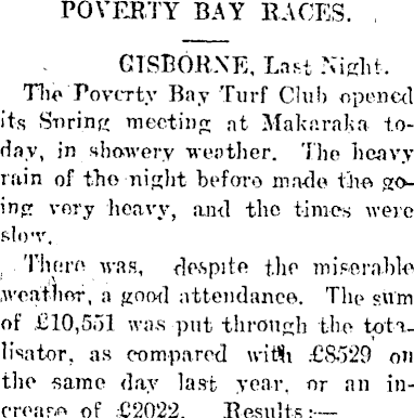 POVERTY BAY RACES. , GISBORNE, Last Night, Tlit* Poverty Bay Turf Club opened its Snring meeting at Makaraka today, in showery weather. Tho heavy rain of tho night before made tire going very licavv, and the times were ftlo'V, There was, de-spite the miserable, weather, a good attendance. The sum of £10,5,")1 was put through the totilisator, as compared witih £8529 on tho same day last year, or an inoroarA of .£'2022. Results :