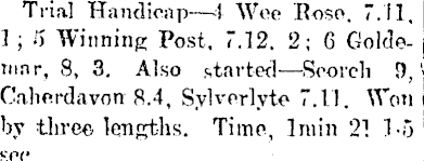 Trial Handicap—4 Woe Rose. 7.11. 1 ; ft Winning; Post. 7.12. 2; 6 Goldernar, 8, 3. Also started —Scorch 9,' Caherdavon 8.4, Sylverlyte 7.11. Won by three lengths. Time, Imin 21 1-5 sec.