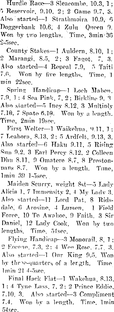 Hurdle Raw —3 Sleaeombo. 10.3, 1; Reservoir, 9.10, 2; 2 Garao 9.7, 3. Also started—l Strathmoira 10.9, r > Doggerbank 10.6, 4 Zulu Queen 9. 'Won by two lengths. Time, 3niin'iG 2-ssec. County Stokes —1 Auldern. 8.10, 1; 2 Mnrangi, S.o, 2; 3 Fagot. 7. 3. ! Also started —4 H-openl 7.9, •"> Taiti 7.H. Won hy five lengths. Time, 1 min 22sec. , Spring Handicap—l Loch Ma ben. 7.9, 1 : 4 Sea Pink, 7, 2; Birkline 9. 3 Also started —Tnev 8.12, 3 Mul'tinly 7.10, 7 Spate 6.10. Won hy a length. Time, 2min 19sec. First Welter —1 Waikehua, 9.11, 1 ; 7 Leahora, 8.13, 2; 5 Ardfelt, 9.13. 3. Also starter]—fi Haku 9.11, 5 Rising Dim 8.11, 9 Omatere 8.7, 8 Prestonnans 8.7. Won hy a length. Time, Imin 39 l-osee. Maiden Scurry, weight 8st —■"> Lady Alicia 1, 7 Immensity 2, 4 My Lnrlv 3. Also started—ll Lord Pat. 8 Ridsdale, 0 Arosine, 4 Lumen, 1 Field Force. 10 To Awo hoe, 9 Faith. 3 Sir Daniel, 12 Lady Cook. Won by two Icneths. Time, olsec. Plying Handicap—3 Monorail. 8, 1 ; Is KnVone. 7.3, 2: 4 Woo Rose. 7.7. 3. Also started —1 Our King 9.;">. Won by tfir->o-|ur<iters of a length. Time Imin 21 4-ssec. Final Hack Flat—l Wakehua, 8..13. 1 : 4 Tyne Lass, 7, 2: 2 Prince Eddie, 7.10. 3. Also started—3 Compliment 7.4. Won by a length. Time. Imin 54 sec.