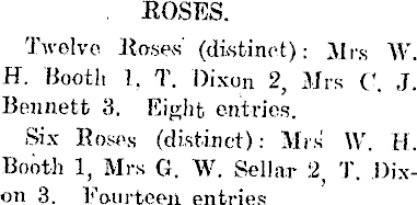 . ROSES. Twelve Hoses' (distinct): Mrs W. H. Booth 1. T. Dixon 2, Mrs C. J. Bennett 3. Eight entries. Six Roses (distinct): Mrs W. H. Booth 1, Mrs G. W. Sellar !2 ; T. Dixon 3. Fourteen entries.