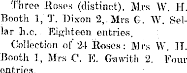 Three Roses (distinct). Mrs W. H. Booth 1, T. Dixon 2,. Mrs G . W. Sellar h.c. Eighteen entries. Collection of' 24 Roses: Mrs W. H. Booth 1, Mrs C. E. Gawith 2. Four ontries.