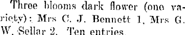 Throe blooms dark flower (one variety) : Mrs 0. J. Bennett 1, Mrs G. W. Sellar 2. Ten entries.
