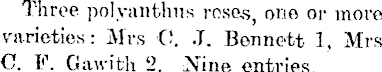 Three polyanthus roses, one or more varieties: Mrs {!. J. Bennett 1, Mrs C. E. Gawith 2. Nine entries.
