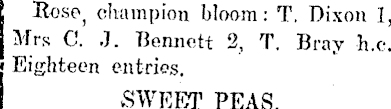 Rose, champion bloom: T. Dixon I, Mrs C. J. Bennett 2, T, Bray h.c. • Eighteen entries. SWEET PEAS.