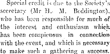 Special credit i-i due to '.lie Society's secretary (Mr 11. .M. Boddington), who has been responsible for much of tho interest and enthusiasm which, has been conspicuous in connection with the event, and which is necessary to make such a gathering a success.