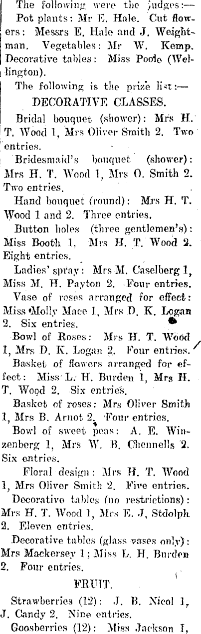 The following were the Judges:— Pot plants: Mr E. Hale. Cut flowers : Messrs E. Hale and J. WeightI man. Vegetables: Mr W. Kemp. I Decorative tables : Miss Pooio (Weli lington). The following is the prize li^t:— DECORATIVE CLASSES. Bridal bouquet (shower): Mrs H. T. Wood 1, Mrs Oliver Smith 2. Two entries. i Bridesmaid's bouquet (shower): Mrs H. T. Wood 1, Mrs 0. Smith 2. Two entries. Hand bouquet (round): Mrs H. T. Wood 1 and 2. Three entries. Button holes (three gentlemen's): Miss Booth 1, Mrs H. T. Wood 2. Eight entries. Ladies' spray: Mrs M. CaseJberg 1, Miss M. H. Pay ton 2. Four entries. Vase of roses arranged for effect: Miss •Molly Mace 1, Mrs D. K. Logan 2. Six entries. * Bowl of Roses: Mrs H. T. Wofkl I, Mrs D. K. Logan 2.. Four entries. Basket of flowers arranged for effect: Miss L. H. Burden 1, Mrs H. T. Wood 2. Six entries. Basket of roses: Mrs Oliver Smith 1, Mrs B. Arnot 2. Four entries. Bowl of sweet peas: A. E. Winzenberg 1, Mrs W. B. Ohennells 2. Six entries. Floral design : Mrs H. T. Wood 1, Mrs Oliver Smith 2. Five entries. Decorative tables (no restrictions): Mrs H. T. Wood 1, Mis E. J, Stdolph 2. Eleven entries. Decorative tables (glass vases only): Mrs Mackersey I; Miss L. H. Burden 2. Four entries. FRUIT. Strawberries (12): J. B. Niool l r J. Candy 2. Nine entries. Goosberries (12): Miss Jackson I,
