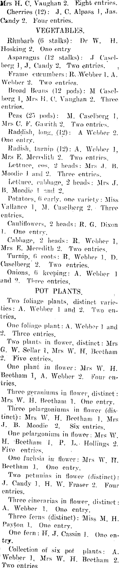 Mrs H. C. Yaughan 2. Eight entries. Chorines (12): J. C. Alp-a-ss 1, >Ta.s. Candy 2. Four entries. VEGETABLES. Rhubarb (6 stalks): Dr W. H. Hosking 2. Ono o/itry Asparagus (12 stalks): J Caselborg 1, J. Candy 2. Two entries. . Frame citcumbers : R. Webber 1. A. Webber 2. Two entries. Broad Beans (12 pods): M Csiselberg 1, Mrs H. C. Yaughan 2. Three entries. Peas (25 pods): M. Caselberg 1. Mrs C. I l '. Ga with 2. Two entries. Raddisli, long, (12): A Webber 2. One entry. Radish, turnip (12): A. Webber I, Mr.s E. Meredith 2. Two en I ries. | Lettuce, cos, 2 heads: Mrs J. B. ! Moodie 1 and 2. Three entries. Let-Liiee. cabbage, 2 beads: Mrs J. B. Moodie I :uul 2. Potatoes, (> early, oni! variety: Miss V a Nance 1, M. Caselberg 2. Three entries. Cauliflowers, 2 heads: B. G. Dixon 1. One entry. Cabbage, 2 heads: 11. Webber 1, Mrs E. Meredith 2. Two entries. Turnip, 0 roots: R. Webber 1, D. Caselberg 2. Two entries. Onions, (> keeping-: A. Webber 1 and 2. Three -entries. POT PLANTS. Two foliage plants, distinct varieties: A. Webber 1 and 2. Two entrios. One foliage plant: A. Webber ] and 2. Three entries. Two plants in flower, distinct: Mrs G- W. Sellar 1, Mrs W. H, Beetham 2. Five entries. Ono plant, in flower: Mrs W. H. Beetham l t A. Webber 2. Knur entries. Three geraniums in (lower distinct: Mrs W. H. Beet-ham 1. One entry. Three pelargoniums in flower (distinct): Mrs W. H. Beetham 1, Mrs .B. Moodie 2. Six entries. One pelargonium in flower: Mrs W. H. Beetham 1, P. L.. Hollings 2. Five entries. ' One fuchsia in flower: Mrs W. IT. Beetham 1. One entry. Two petunias in flower (distinct) : •J. Candy 1, FT. W. Fra-ser 2. Four entries. Three cinerarias in flower, distinct: A. Webber 1, One entry. Three ferns (distinct): Miss M. H. Pay to u 1. Ono entry. One fern: H. J. Cassin I. Ono entry. Collection of six pot plants: A. Webber 1, Mrs W. H. Beetham 2. Two entries.