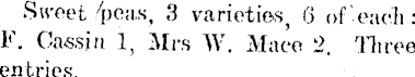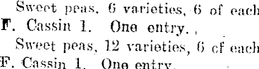 Sweet peas. 6 varieties, (} of each F. Cassin 1. One entry. , Sweet peas, 12 varieties, <> of each F. Cassin 1. One entrv.