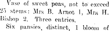 Vase of sweet peas, not to exceed 2 ) stems: Mrs B. Arnot 1, Mrs H. Bishop 2. Three entries. Six pansies, distinct, 1 bloom of