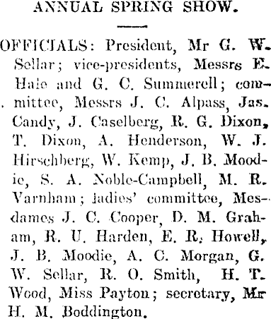 ANNUAL SPRING SHOW. OFFICIALS: President, Mr G. W. Sellar; vice-presidents, Messrs EHaie mid G. C. Summerell; com- . mittee, Messrs J. C. Alpass, Jas. Candy, J. Caselberg, It. G. Dixon, T. Dixon, A. Henderson, W. J. Hirschberg, W. Kemp, J. 15. Moodie, S. A. Noble-Campbell, M. R. Varnham ; ladies' committee, Mes—dames J. C. Cooper, D. M. Graham, R, U. Harden, E. R, Howell, J. 13. Moodie, A. C. Morgan, G. W. Sellar, 11. O. Smith, H. T„ Wood, Miss Payton; secretary, Mr H. M. Boddington.