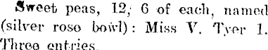 Sweet peas, 12; 6 of each, named (silver roso bowl): Miss Y. Tver 1. Three entries.