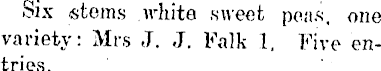 Six «tems white sweet pea.s, one variety: Mrs J. J. Folk 1, Five entries.