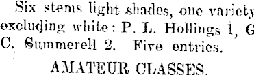 Six stems light shades, one variety excluding white: P. L. Hollings 1, G C. Summerell 2. Five entries. AMATEUR CLASSES.