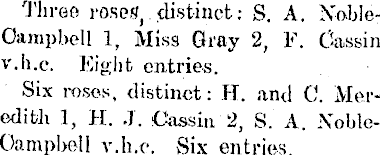 Throe roso« t distinct: S. A. NobleCampbell 1, Miss Gray 2, F. Cassin v.h.c. Eight entries. Six roses, distinct: H. and C. Meredith 1, H. J. Cassin 2, S. A. NobleOampbell v.h.c. Six entries.