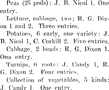 Peas (25 pods): J. B. Nicol 1. Ono entry. Lettuce, calibage, two; 11. G. Dixon 1 and 2. Three entries. Potatoes, 6 early, one variety: J. B. Nicol 1, C. Corkill 2. Fivo entries. Cabbage, 2 heads: R. G. .Dixon 1. Ono entry. Turnips, <i roots: J. Candy 1, It. G. Dixon 2. Four entries. Collection of vegetables, 5 kinds: ,T. Candy 1. One entry.
