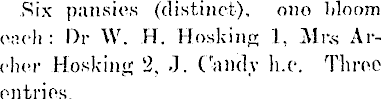 Six pansies (distinct), ono hloom each: l)r W. H. Hosking 1, Mr.s Archcr Hosking 2, J. Candy h.c. Three entries.