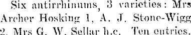 Six antirrhinums 13 varieties: Mrs Archer Hosking 1, A. J. Stone-Wigg 2, Mrs G. W. Sellar h.c. Ten entries.
